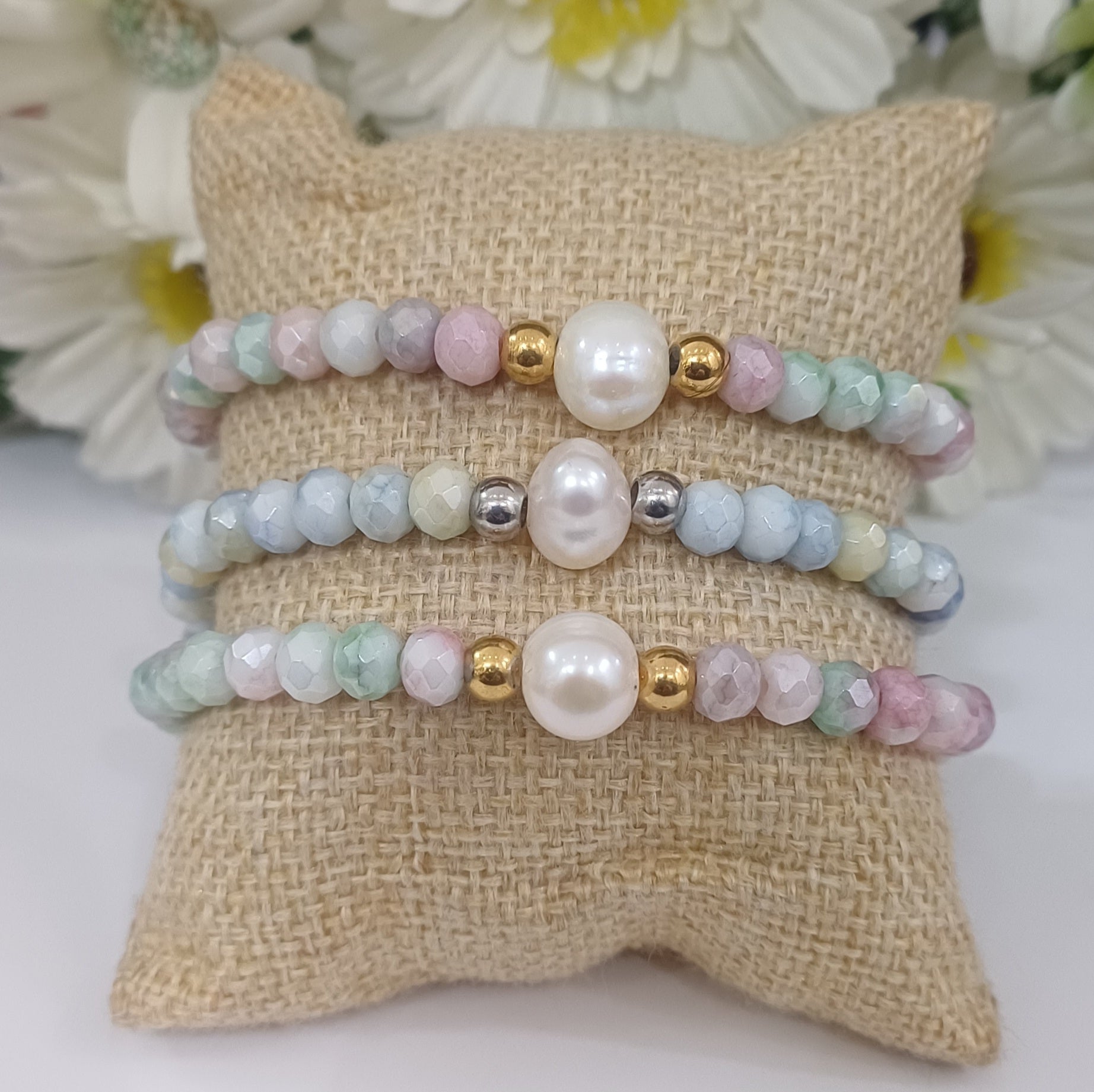 Large fresh water pearls with silver or gold stainless beads with different coloured glass crystals. All 18cm on elastic band.