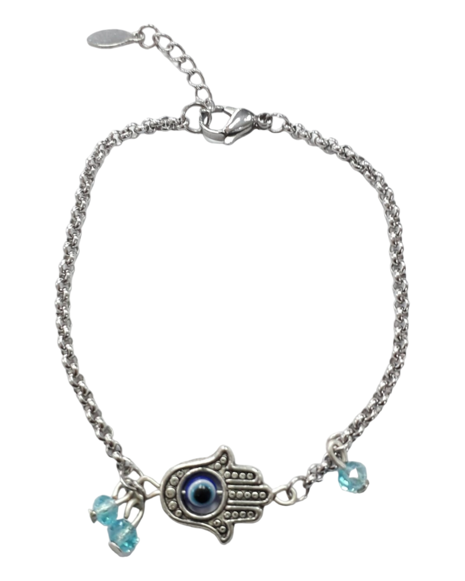 Stainless steel chain with a hamsa hand. An evil eye is attached in the center of the hamsa. Some small crystals attached onto the chain.
