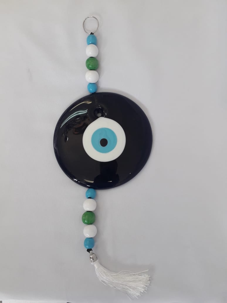 15cm Glass diameter evil eye with decoration of ceramic and wood large beads. Can be hung in a home, office or shop, given as a gift.