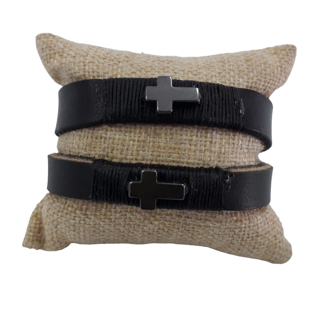 Leather thick bracelet with a hematite cross attached to the top of the leather. It has an adjustable close that makes fitting of the bracelet easy.