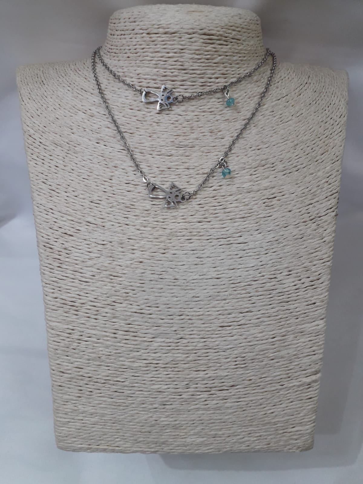 Stainless steel angel on sideways, attached to a Stainless steel chain in silver. A little crystal attached on one side of the necklace.