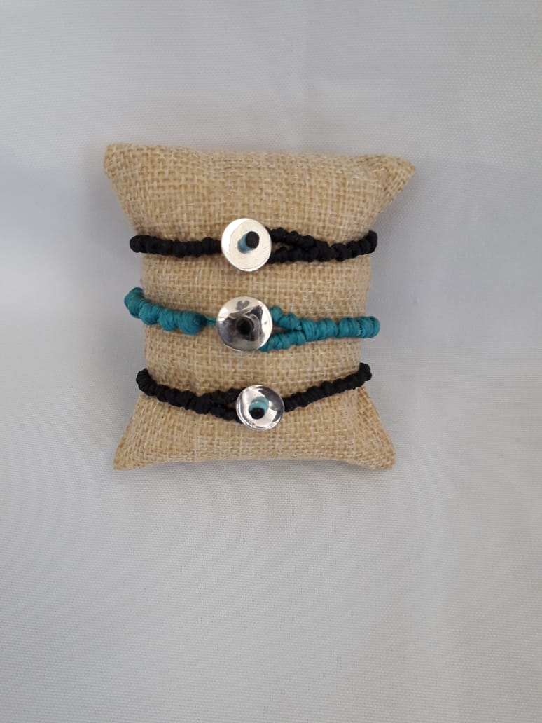 Sterling silver disc on a knotted waxed cord bracelet attached with a blue bead and a red cord.