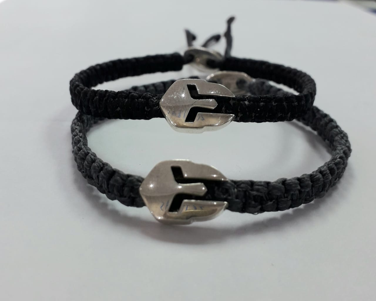 Sterling silver Spartan Helmut on a men's thick black macrome with buttons at the back to fasten the bracelet.