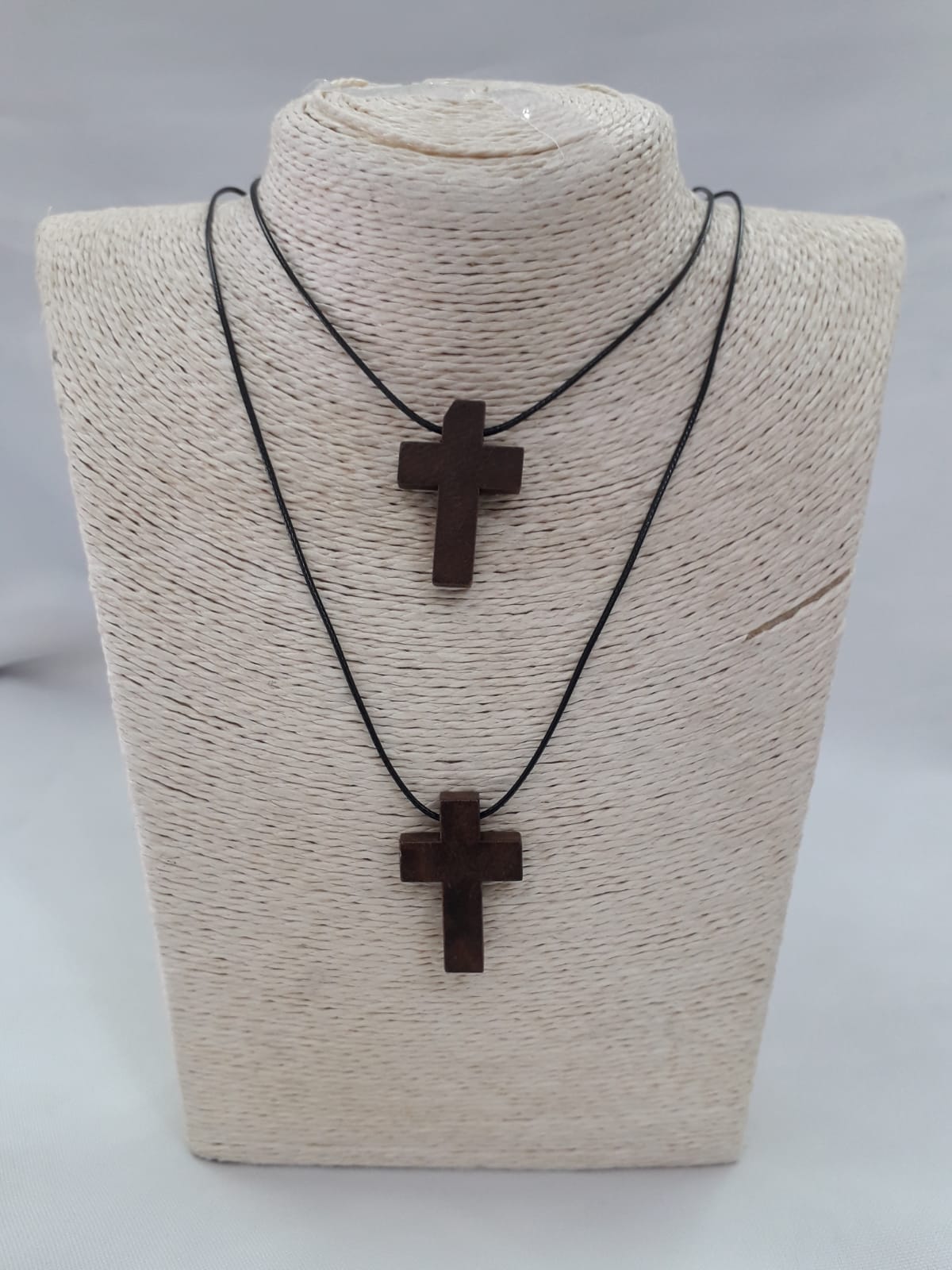 3cm long dark brown wooden cross hanging from a waxed black cord with an adjustable knots to open and close.